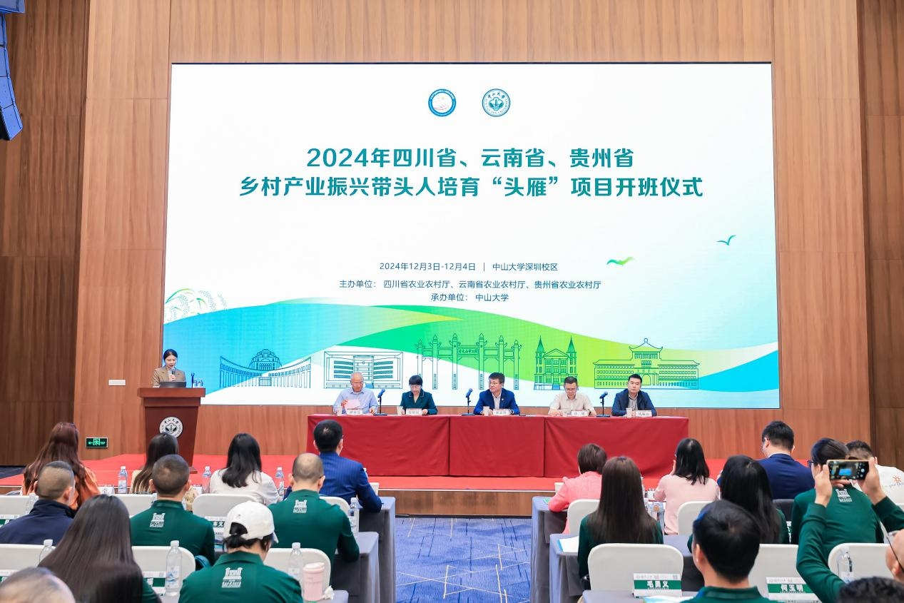 近日,2024年云南、贵州、四川乡村产业振兴带头人培育“头雁”项目联合开班仪式在中山大学深圳校区隆重举行。来自三省的近320名新型农业经营主体带头人齐聚一堂,正式开启为期一年的系统性、定制化、体验式、孵化型培育。中山大学副校长邰忠智、四川省农业农村人才发展服务中心主任徐旭、云南省农业广播电视学校校长付晴岚、贵州省农业农村厅副处级干部代振江等领导出席了开班系列活动。中国工程院院士、农业机械化工程专家罗锡文教授和欧洲自然科学院外籍院士、中山大学生命科学学院苏薇薇教授联袂为三省学员带来精彩绝伦的“头雁”第一课。
