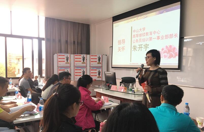 4月11日,培训班举行了隆重而有中大特色的开学典礼,由中山大学高等继续教育中心的教务老师兼本次培训班班主任刘梦琪主持,首先大学高等继续教育中心公务员培训事业部的朱开宇部长发表讲话,点明中山大学高等继续教育中心在全国公务员培训中的重要作用和地位,选择中大将会获益匪浅。最后还强调在培训期间的纪律问题,并且提醒每个学员都要注意人身安全、财产安全和政治安全!