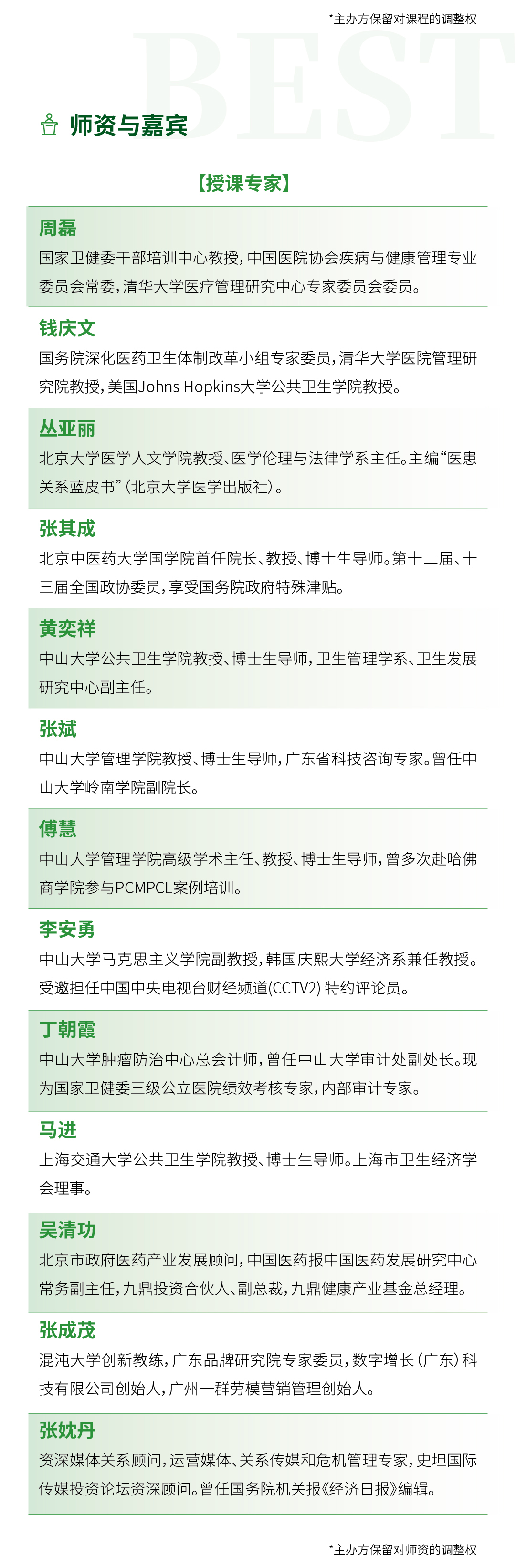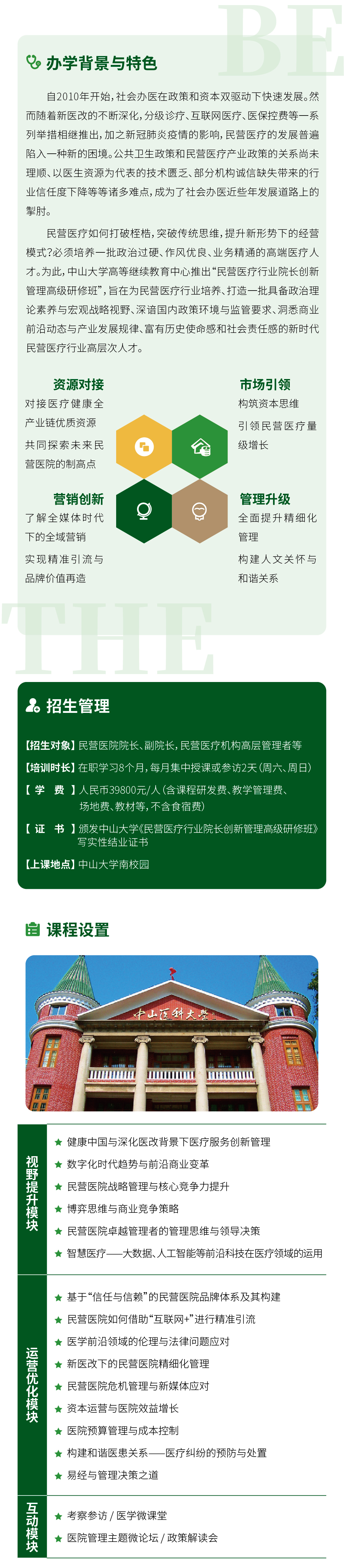 中大干部培训基地 > 办学项目 > 企业培训 > 公开课项目 > 民营医疗行业院长创新管理高级研修班 公开课项目 企业家工商管理高级研修班 经理人工商管理研修班 青商学堂 企业家工商管理高级研修班(深圳班) 经理人工商管理研修班(深圳班) 领军企业家科技与人文高级研修班(一期) 工信部中小企业经营管理领军人才班 财务总监高级研修班 金融投资与资本运作研修班 营销管理高级研修班 民营医疗行业院长创新管理高级研修班 企业家财务思维训练营 企业骨干人才梯队培养课程 民营医疗行业院长创新管理高级研修班